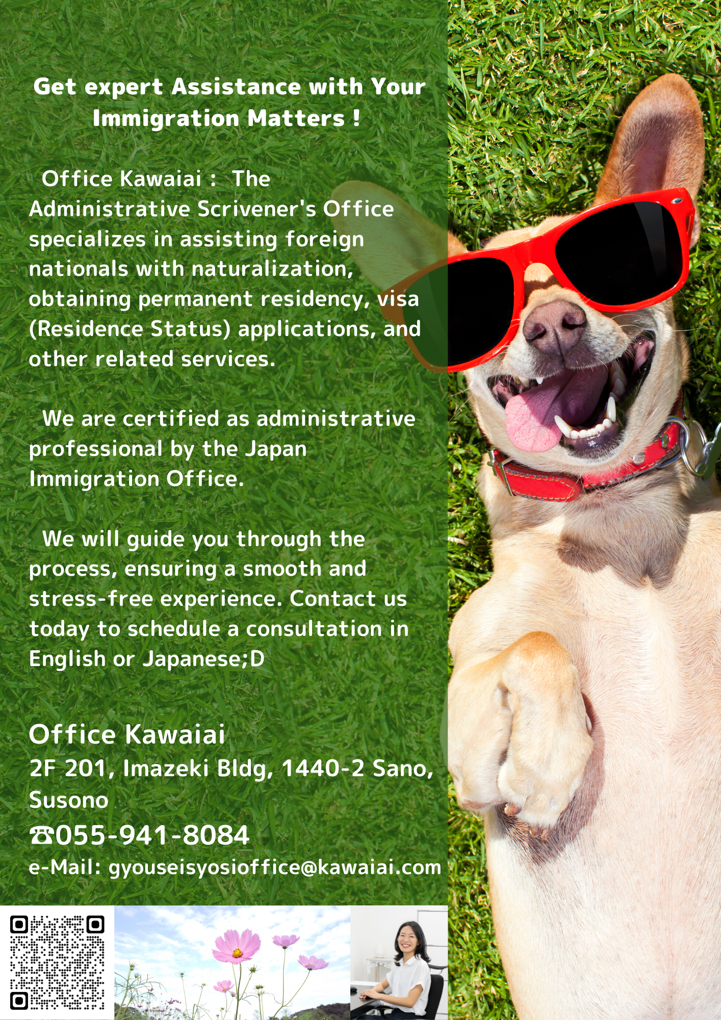 Office Kawaiai : The Administrative Scrivener's Office specializes in assisting foreign nationals with naturalization, obtaining permanent residency, visa (Residence Status) applications, and other related services. We are certified as administrative professional by the Japan Immigration Office.